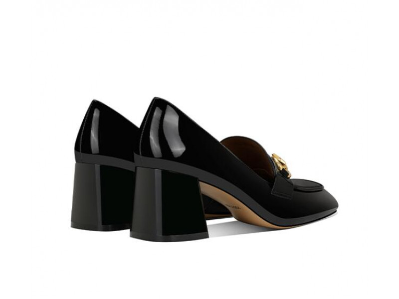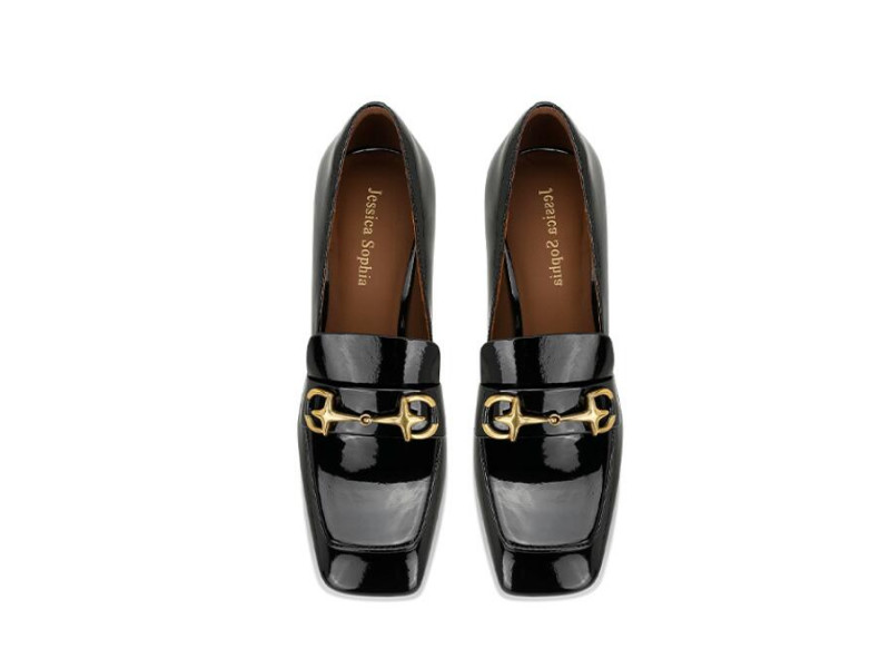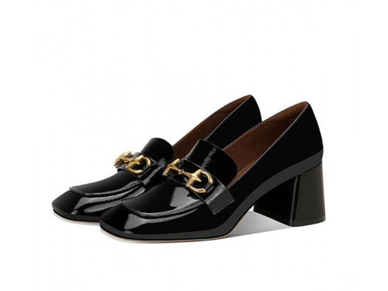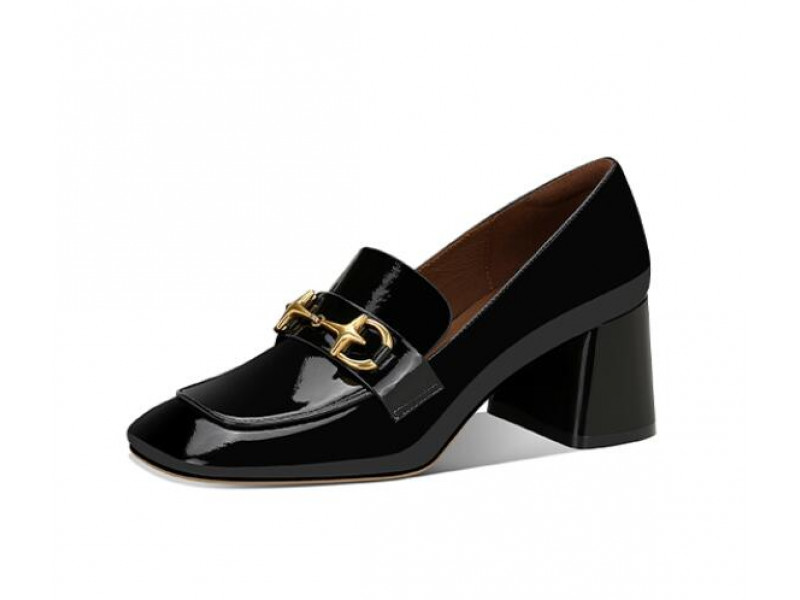 Stylish black patent leather horsebit square chunky heel loafers